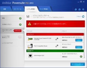 Uniblue PowerSuiteでは有料版の大きな特長である、高速フルスキャンも体験できます。ボタンをワンクリックするだけで、レジストリ内の無効なエントリやジャンクファイルの検索など、最適化に関するチェックが隅々まで行われます。ほんの数分でスキャンは終了し、調整が必要な項目が赤の吹き出しで示されます。それぞれの検出結果などは上部のタブで切り替えて確認できます。結果を修復する際には製品版へのアップグレードが必要となりますが、スキャンスピードと現在の状態を知るだけでも試す価値はあるでしょう。そのほかWindows向けの最適化ソフトには、ウイルス対策機能も備えた万能PC最適化ソフトAdvanced SystemCare with Antivirusや、不要なファイルやデータ情報などを消去できるCCleanerなどがあります。